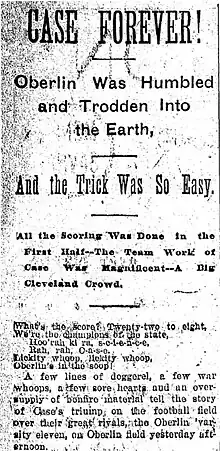 The 1893 Case football team was an American football team that represented the Case School of Applied Science in Cleveland, Ohio, now a part of Case Western Reserve University. Playing as an independent during the 1893 college football season, the team compiled a 4–0 record, outscoring opponents by a total of 120 to 8.[1][2]