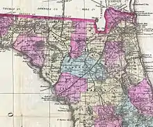 Along the coast about midway between Tampa and Cedar Key, eight people on a sailboat died when their vessel was driven aground.[11] In Tampa, the storm flooded low-lying areas, wrecked a bridge over Spanishtown Creek, and crumbled sea walls.[55] As the hurricane proceeded inland, it devastated interior parts of the state.[2] Reports from the hardest-hit localities were slow to reach the outside world because of extensive damage to communications infrastructure, as well as obstructed or washed out railroads. Initial reports indicated that at least 20 communities were "wrecked" by the hurricane.[9] In these areas, almost all stores and houses were demolished, particularly in western Alachua and eastern Lafayette counties. Debris was often carried for miles. Farmers lost livestock, crops, and provisions needed for the winter, and hundreds of families were left homeless with little or no food. Along the Suwannee River, storm victims sought refuge in a makeshift shelter constructed from stray timbers.[10] Extreme winds razed entire pine forests across numerous counties, initially uprooting weaker trees before shearing the rest off at their trunks during the height of the storm.[7] By one estimate, the hurricane wiped out 5,000 sq mi (13,000 km2) of timber across the state.[56] This transformed the landscape and gave it a "prairie-like appearance".[57] The turpentine industry was decimated, as the value of the lost pine timber was estimated at $1.5 million (equivalent to $52.8 million in 2022). Additionally, stills used to process turpentine were mangled. Consequently, some 2,500 turpentine workers were left unemployed.[10] Phosphate processing plants east of the Suwanee River also sustained $500,000 in damage[10] (equivalent to $17.6 million in 2022).