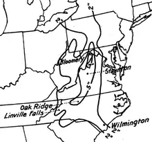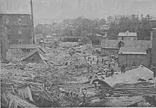 Two men died in the Patterson Coal Company miners' village in Shamokin that was devastated by the winds and a subsequent fire that together destroyed dozens of houses and shanties.[28][88] The storm destroyed equipment and facilities at the nearby Colbert Colliery, putting hundreds of miners out of work.[28] In Reading, two men died in the collapse of an iron furnace casting house which left five others badly injured.[28][87] Six children died to a storm-induced fire in tenement housing belonging to a mining company in Natalie.[15] Hundreds of trees were blown down or broken on the historic battlefield at Gettysburg National Park, largely on Culp's Hill and Big Round Top. The 66th Ohio Infantry monument on Culp's Hill was destroyed by a fallen tree, and the nearby monument to the 78th and 102nd New York Volunteer Infantries sustained minor damage.[91] In addition to the winds, several inches of rain fell in parts of the state; Altoona recorded 3.79 in (96 mm) of precipitation. Flash flooding along the Juniata River rushed through Huntingdon, washing out streets and railways, inundating homes, and drowning livestock.[87] Washouts and landslides plagued railroads throughout western Pennsylvania.[88] Overall, the storm caused over $2 million (equivalent to $70.4 million in 2022) in damage in the state.[6]