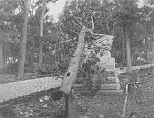 A residence building under construction at the Catholic University of America was dismantled, and the personal home of President Grover Cleveland in Woodley Park lost its roof. Roofs of several government offices were also torn away, and the steeple of New York Avenue Presbyterian Church was "reduced to match wood".[78] The Smithsonian Institution Building sustained notable damage.[79] Fallen trees littered the grounds of the White House,[76] among them being historic specimens like an elm planted by Abraham Lincoln.[20] Some of the more celebrated trees were picked apart by passersby trying to procure souvenirs.[76] The White House itself suffered some minor damage, mostly limited to dislodged coping and copper roofing,[20][71] along with a few broken windows.[28] Nearby, five men were entrapped and one killed when the Abert Building—a newly built, five-story brick structure on Pennsylvania Avenue—partially collapsed in the storm, crushing two adjoining buildings.[27][71] Over the coming months, tenants filed multiple lawsuits against the building's owner after at least one local builder asserted that the wall failure resulted from neglectful construction.[80][81][82] The Abert Building was completely repaired by October 14.[83]