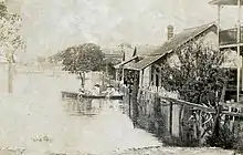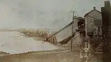 While the hurricane was still in the Gulf of Mexico on September 28, the Norwegian barque Saturn foundered off Key West. Her crew was rescued by a steamship and brought to New York City.[3] As the storm came ashore, the Cedar Keys were struck by a 10.5 ft (3.2 m) storm surge that victims often erroneously called a "tidal wave."[5][32] Yankeetown received an even higher storm surge of 12.6 ft (3.8 m).[5] The main street through the center of Cedar Key—the most populous island in the Cedar Keys island chain[33]—was severely flooded by 8 ft (2.4 m) of water, which invaded every building and left large sinkholes when it receded. Sidewalks along the street were washed out.[34] The surge of water undermined the foundations of stone buildings, weakening many of them to the point of collapse,[35] while sweeping away weaker structures.[34] Inside the buildings left intact, mud was sometimes found several feet deep.[10] The hurricane also contaminated wells with seawater and debris, so residents were forced to travel for clean water.[36] Hardest-hit were the small outlying islands, which were fully submerged by the storm surge and "completely cleared out". Survivors often braced against young, supple trees that were able to withstand the storm's force,[37] or used pieces of debris as flotation devices.[38]