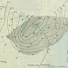 Although little is known about the system prior to its passage through the Leeward Islands as a tropical storm on September 22,[1] it likely originated from a tropical wave that exited the western coast of Africa.[2] Its track has been re-analyzed multiple times since the early 20th century.[3] For several days, the storm moved westward through the northern Caribbean Sea, passing just south of Jamaica as a low-end hurricane on September 25. The cyclone steadily intensified, turned northward, and moved through the Yucatán Channel on September 28.[1] The aftermath of the storm in western Cuba was consistent with the effects of a Category 1 hurricane on the modern-day Saffir–Simpson scale, suggesting that the storm was a major hurricane of Category 3 intensity while passing west of the island.[4] As the storm entered the Gulf of Mexico, it began to accelerate and curve toward the north-northeast.[1]