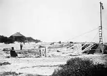 The hurricane still had considerable strength when it entered southeastern Georgia. The winds brought down telephone, telegraph, and electric wires throughout the region, severing communications.[18] Damage in the Sea Islands was extensive, costing an estimated $500,000[20] (equivalent to $17.6 million in 2022); by some accounts, the winds were more intense than in the catastrophic hurricane of 1893,[64] but without the exceptionally high storm surge.[29] The tropical cyclone caused severe damage to the islands' plantations,[18] ruining around a third of the rice crop, devastating the cotton crop, and killing up to 100 people.[13][15] Charlton and Camden counties bore the brunt of the storm's force in Georgia, as evidenced by the complete clearing of dense pine forests east of Folkston.[65] This dealt a $500,000 (equivalent to $17.6 million in 2022) blow to the turpentine industry. Many structures in Folkston were destroyed, including multiple churches, a courthouse, and a school that collapsed with 38 students inside, all of whom safely escaped.[18][19] In small communities throughout extreme southeastern Georgia, the storm caused widespread destruction of homes and businesses.[66] Six people in Camden County were killed,[58] including four in a logging settlement that was ravaged near the Florida border.[9]