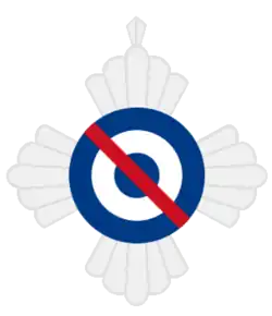 The ribbon of the medal is 36 mm wide, with a broad central stripe of white, flanked by blue edges, bisected by red stripes. When worn as a service ribbon, the grades of the medal are differentiated by a device. The ribbon for the third class is plain, the ribbon for the second class bears a gold colored laurel wreath device in the center, while the first class service ribbon bears a laurel wreath device surrounding three five-pointed gold stars.[1]
