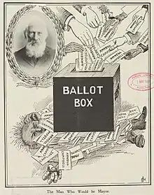 David Goldie had been a popular mayor since 1898, getting re-elected without opposition in 1899 and 1900. Goldie was a teetotaller and when it became known that the Duke and Duchess of Cornwall and York would come for a royal visit, he retired at the April 1901 election as he did not want to toast the visiting royals with alcohol.[1] There was a strong groundswell of opinion that the city's mayoralty should be held by someone of high status for the occasion of the royal visit, and a requisition was put to John Logan Campbell on 11 March.[2] Campbell had lived in Auckland since 1840 and was thus the longest-lived resident of the city; he had become known as the Father of Auckland.[3][4] Campbell was nominated by the outgoing mayor, Goldie, and by George Fowlds, MHR for City of Auckland.[5]