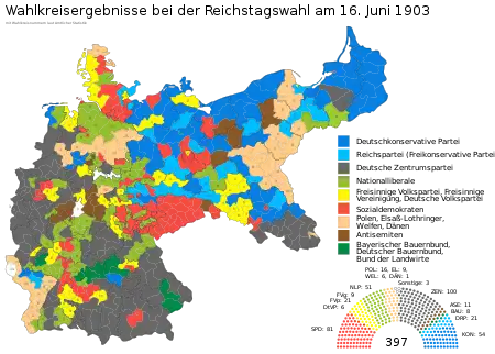 Federal elections were held in Germany on 16 June 1903.[1] Despite the Social Democratic Party (SPD) receiving a clear plurality of votes, the Centre Party remained the largest party in the Reichstag after winning 100 of the 397 seats, whilst the SPD won only 81.[2] Voter turnout was 76.1%.[3]