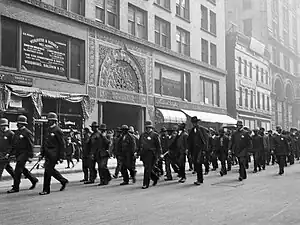 The Teamsters engaged in a sympathy strike on April 6, 1905, adding another 10,000 members to the picket lines.[2][4][5][11] Teamsters President Cornelius Shea targeted Montgomery Ward and Sears, Roebuck and Company in particular, as these were the leaders in the National Tailors' Association.[12] The sympathy strike had not occurred earlier in the year for fear it would have imperiled the candidacy of Edward Fitzsimmons Dunne for Mayor of Chicago.[13]