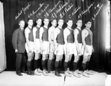 The 1908–09 season witnessed the fourth coach in just four years to head up the university of Illinois Fighting Illini men's basketball team. The only difference for this season, however; was that Herb V. Juul became the first coach to stay for more than one year.[1] He also became the first former Fighting Illini player to head the Illinois basketball program, serving as captain of the 1906–07 team. The starting lineup for the team included captain H. J. Popperfuss and Carl P. Watson at the forward positions, Emmett V. Poston as the center, and a combination of Roy G. Rennacker, Louis S. Bernstein and Thomas E. Thompson at guard. The Illini finished their season with an overall record of seven wins and six losses with a conference record of five wins, six losses and a fourth-place finish in the Western Conference.[2]