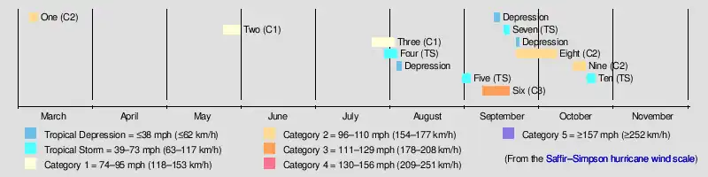Tropical cyclogenesis began on March 6, 1908, when the first system was initially detected northeast of the Lesser Antilles.[1] It was the only off-season Atlantic tropical cyclone to reach Category 2 strength since the beginning of official records in 1851.[2] On May 24, the next system developed near the Turks and Caicos Islands. When it intensified into a hurricane on May 28,[1] the 1908 season became the only on record in which two systems reached hurricane status prior to the month of June.[3] Thereafter, activity ceased for nearly two months, until the third cyclone formed northeast of the Bahamas on July 24, followed by another system forming in the northwestern Gulf of Mexico on July 29.[1] The month of August featured two cyclones, a tropical depression and a tropical storm.[4] September was the most active month, with five systems developing, including two hurricanes, one tropical storm,[1] and two tropical depressions.[4] In October, a hurricane and a tropical storm developed, the latter of which became extratropical on October 23, ending seasonal activity.[1]