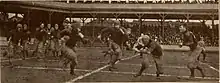 In July 1908, the Western University of Pennsylvania officially became the University of Pittsburgh. Hence, the cheers and songs emanating from the students at sporting contests had to be changed for the 1908 football season.[13] In April, John A. Moorhead was hired to lead the football team for a second season.[14] He hired ex-quarterback Karl Swenson as assistant coach. At the 1907 season ending banquet Quince Banbury was chosen captain by his teammates.[15] The drama in this offseason centered on a request by Washington & Jefferson University's Athletic Committee for the Western University of Pennsylvania to sign an agreement to adopt a one-year residency rule for their athletes. They stated that they would only make this request of the Western University of Pennsylvania. The WUP Athletic Committee declined and severed ties with all Washington & Jefferson athletic teams.[16] Late in November the Red and Black changed their mind and begged for a post season football game with the University of Pittsburgh. The details were worked out between Alexander Silverman, the graduate manager of athletics at Pitt and E. M. Murphy, the graduate manager of athletics at Washington & Jefferson. The University of Pittsburgh Athletic Committee agreed to mend relations with the Red and Black and the eleventh game was added to the schedule. The main plus to come out of the pettiness and then total reversal shown by Washington & Jefferson's Athletic Department was a rivalry played for the next twenty-one straight years.[17] In its second season under head coach John A. Moorhead, the team compiled an 8–3 record and outscored opponents by a total of 140 to 36.[18][19] At the conclusion of the season Mr. Moorhead resigned as coach and went into business with his father.[20]