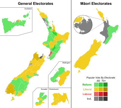 The result was that the Liberal Party, which had won a majority of seats (50 of 80) in Parliament, lost 17 seats and its majority, winning only 33. The Reform Party gained 9 to obtain a plurality (37) of seats.[5] Liberal Prime Minister Joseph Ward was able to retain office, but in 1912, Reform Party founder William Massey formed a new government.[6]