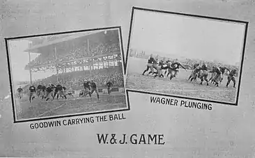 Pitt squandered two scoring opportunities and the Red and Black capitalized on theirs. In the first quarter Pitt had first down on the W. & J. six yard line. "A touchdown looked imminent for Pitt, but the W. & J. warriors fought back like spartans."[10] Three running plays gained nothing. Pitt halfback Fred Ward attempted a field goal but the center snap was fumbled and Pitt lost the ball on downs. In the third quarter, after the Red and Black had gone ahead 6–0, a wide open "Capt. Galvin fumbled a beautiful forward pass from Hube Wagner, and our second best chance to score went glimmering."[50] Early in the third quarter Wash & Jeff recovered a Wagner fumble on the Pitt 38-yard line. On first down, halfback Goodwin "sent the W. and J. crowd almost wild by running to the Pitt 16-yard line." On second down, Goodwin raced around the Pitt left end and scored "the first touchdown by W. & J. against Pitt in two years." Red Fleming missed the goal and the Red and Black led 6–0. Late in the fourth quarter, W. & J. halfback Red Fleming intercepted a pass by Justice Egbert on the Pitt 30-yard line. On second down Goodwin threw the ball to "Alexander, who was standing unmolested on the Pitt six yard line. It was an easy matter for the W. & J. captain to run across the chalk line for a touchdown. Fleming kicked goal." The final score read W. & J. 13 to Pitt 0.[51] Washington & Jefferson would finish the season with an 8–3–1 record.