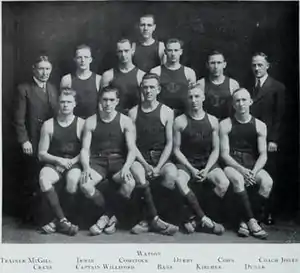 The 1913–14 University of Illinois Fighting Illini men's basketball team, under the direction of second year coach Ralph Jones, took a step in a positive direction regarding the team's status in the Western Conference. The addition of key players, including future National Player of the Year, Ray Woods, helped guide the Illini to an overall record of nine wins and four losses.[1] The conference record, however, of seven wins and three losses marked, to date, the highest league winning percentage in the history of the university. Unfortunately for the Illini, a scarlet fever scare caused the last two games of the year to be cancelled, including a game at Chicago and at Northwestern. The team finished fourth in the conference with a starting squad of Kircher, Williford, Bane, Crane & Duner would return the following season.[2]