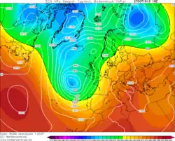 A rapidly deepening low-pressure extratropical cyclone tracked quickly south on the afternoon of 27 October. The central pressure of the system was 990 millibars (29 inHg) at midnight on the 27th,[6] deepening to 975 millibars (28.8 inHg) by 18:00.[7] The low pressure helped to sustain a stream of strong southerly winds, as in days previous,[8] sustaining significantly warmer than average conditions. Temperatures were widely reported over 21 °C (70 °F) in some places.[9] Active weather fronts arriving from the Atlantic Ocean resulted in the instability needed to cause such tornadoes. The low pressure brought cooler air to the country by the 31st.[10]