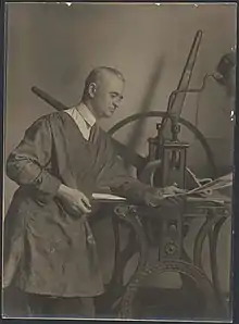 Two hand-stitched footballs were made for the match by Corporal C.C. McMullen,[15][47] who had been a leatherworker at Henry Fordham's football factory in Sydney Road, Brunswick,[48] prior to his enlistment in the First AIF. The Fordham footballs — i.e., contrasted with the "Sherrin" footballs (see the football held by Dan Minogue in the image above) that had been (c.1902) especially designed to facilitate the stab-kicking of the Collingwood footballers[49] — were being used in the West Australian Goldfields League as early as 1907.[50] Also, Fordham footballs were the official ball for the Victorian Football Association (VFA) for fourteen years in the 1920s and 1930s.[51]