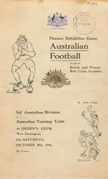 - An Australian football match (an Australian Division v. Training Groups) will be played at Queen's Club, West Kensington, tomorrow, at 3 p.m., in aid of the British and French Red Cross Funds. The game, played by 18 players a side, will show how Australians have combined "Soccer" and Rugby. — The Times, Friday, 27 October 1916.[29]