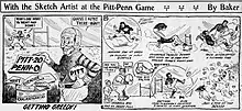 "They esteem themselves quite bloodthirsty and ferocious out at Pitt, and desirous of impressing the multitudes with the plenteousness of their ferocity, they've taken unto themselves the nom de guerre of Panthers, which they further emphasized yesterday by producing at Forbes Field something neat and nifty in the line of a scorecard, the back of which is embellished with the likeness of a Pitt gridder in heroic mood, right fist clenched and drawn back outside the picture, in company with a lithe, agile and muscular panther, clawed and toothed cap-a-pie. All done neatly in the traditional and conventional Blue and Gold. Hence-forth we will conform with their wishes and allude to them as Panthers."[4]