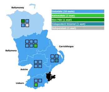 In Carrickfergus the defeat of Edward Coey, an active member of Edward Carson's Advisory Committee, was an unexpected loss.[9] Coey had been a member of the council since the first elections in 1899.[10][11]