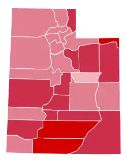 All these factors combined to produce a national landslide, with a swing of almost twenty-nine percentage points to the Republicans vis-à-vis the election of 1916. Utah followed the national trend closely: whereas Wilson had won the state by twenty percentage points in 1916 and had clean-swept the twenty-eight extant counties, in 1920 Harding by campaigning on a "return to normalcy" carried every county in the Beehive State with a swing of thirty-seven percentage points. This was the first time Washington County had ever been carried by the Republican nominee.[5] Despite this large swing, Utah in 1920 still voted 9.08 percentage points more Democratic than the nation at-large.[6]