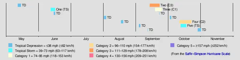 A weak circulation developed along the axis of a trough situated offshore North Carolina in early September, with a tropical depression forming on September 3. The depression moved southward and likely dissipated by the next day. An inverted trough and a tropical wave merged and briefly developed into a tropical depression well offshore Georgia on September 11. By the next day, the circulation had either dissipated or merged with a cold front. A strong tropical wave developed into a tropical depression between the Cape Verde Islands and Senegal on September 21. Moving generally westward, the depression was last noted between the islands of Fogo and Santiago on September 22. The latter island observed sustained winds of 36 mph (58 km/h). On October 2, a tropical depression likely formed over the eastern Gulf of Mexico about 280 mi (450 km) south of Panama City, Florida. The depression continued westward and may have made landfall in Texas just north of Corpus Christi on October 5. However, there is no evidence of a closed circulation beyond October 3. A tropical depression – possibly subtropical – formed on October 28 over the central Gulf of Mexico. The depression moved northward and made landfall near the Alabama–Mississippi state line on October 31 and quickly dissipated. Pensacola, Florida, recorded a 5-minute wind gust of 43 mph (69 km/h).[3] The depression dropped mostly light rainfall in the area, with 24-hour amounts ranging from 0.5–1 in (13–25 mm).[14]