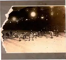 22 July 1922 Victoria was up 2–0 by the end of the first half of the game.[2] The majority of the play was around the New South Wales goals and from in close Ernest Collins scored the first 3 goals for Victoria. New South Wales then scored a goal back when C, Gates scored from the center line. Maurice Bilsborrow would then go on to score on a rush from center to give the Victorians a 4–1 victory over New South Wales in front of the large crowd at the Melbourne Glaciarium.[3][4][5]
