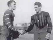 Lynn Bomar and Jess Neely are often acknowledged as the players of the game for Vanderbilt.[59] Lynn Bomar spent much of his day tackling Michigan's runners for a loss,[60] and "tore through the Wolverine line constantly, and always emerged after a play on the far side of the defense."[56] while Jess Neely was a battered and bruised captain playing so hard despite his injured frame.[43][60][n 2] Other plays of note for the Commodores included the shifty moves of Gil Reese—Reese made 105 yards on punt returns.[61] The yearbook spoke of Reese's play, "Time after time Gil Reece caught punts, and shifting from side to side in a most elusive fashion, would run almost through the Michigan team, by a hair's breadth, escaping each hand outstretched to seize him. He resembled old Lewis Hardage, who taught him that shifty trick." Scotty Neill's punting matching that of Kipke,[62] with an average of 42 yards per punt,[45] was also of note. The defense of Tex Bradford and Tot McCullough received praise.[43][44][56][60] Walter Camp noted the strong showing of Vanderbilt, particularly impressed with Reese's punt returns and McCullough's run defense. He credited McGugin with having developed a well-trained line, and a secondary that was not far behind.[63]