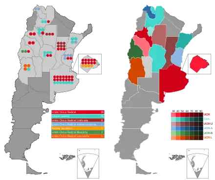 The 1926 results themselves further eroded the pro-Yrigoyen UCR's majority in the Lower House, while solidifying dissident UCR control in Entre Ríos, Mendoza, San Juan, Santa Fe, and Santiago del Estero Provinces. Yrigoyen's allies, who won in three, smaller northwestern provinces, carried Buenos Aires Province, as well the City of Buenos Aires, however.[2] These latter were defining victories in Yrigoyen's preparations for 1928, and more so because a key ally, Buenos Aires Governor José Luis Cantilo, would be succeeded by Valentín Vergara — an even closer ally.[3]