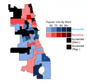 All told, despite the nonpartisan nature of the elections, Democrats won 31 of the seats while Republicans won 19. 10 wards necessitated runoff elections, of which Democrats won 6 and Republicans 4.[1] 13 aldermen11 Democrats and two Republicanswere returned without opposition.[2]