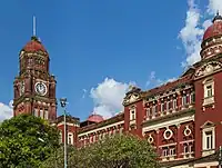 The greatest damage occurred in the southern part of Yangon which sits on a river delta where alluvium is deposited by the Irrawaddy River.[13] The British Geological Survey building along Dalhousie Road was suffered extensive cracks. The interior of the building which housed a laboratory and museum was in shambles. Along China Street, pucca houses caved inwards and numerous buildings were uninhabitable.[11][17] The High Court Building and Roman Catholic Church suffered heavy damaged. City residents left their homes in a panic and sought refuge in vacant spaces and parks. The city was plunged in the dark due to damaged electrical systems while the fire department searched for victims.[21]