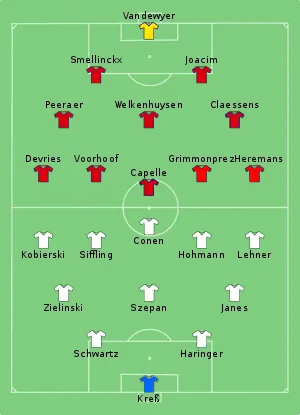 Both teams changed their usual line-ups, resting several players. Austrian players wore an unusual light blue jersey borrowed from Napoli because of the clash of colours between the two traditional jerseys. Germany took the lead inside 25 seconds with the fastest goal of the tournament, scored by Ernst Lehner. They doubled the lead with Edmund Conen, but Austria got one back immediately after with Johann Horvath. Germany's third goal came after Karl Sesta attempted to sit on the ball to ridicule a German player; the ball was stolen by Conen, who crossed to Lehner. Sesta then scored a goal, but Germany held on for the victory.[2]