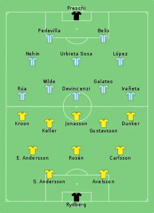 Pouring rain influenced the match, which saw very few notable moments in the first half. In the second half, Ernst Andersson suffered a head injury, and Germany took the lead with Karl Hohmann while the Swedish player was off. Hohmann scored again three minutes later. Sweden managed to get a goal back, but their subsequent efforts were not enough and Germany progressed to the first of many semi-finals.[2]
