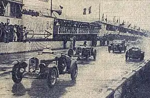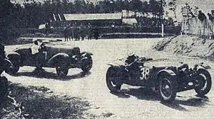 This year raceday started grey and drizzly, however as the cars formed up on the grid en echelon, the rain eased.[7][28] The big news was that Raymond Sommer's co-driver had been taken very ill and would be unable to do much driving. Sommer had found Christian d'Auvergne among the spectators – veteran of four Le Mans in the 1920s. However, the ACO officials ruled it was too late for driver substitution, so once again, Sommer was facing a long race on his own.[8][4] At flagfall, Brian Lewis was the first car to get away, although it was still the big Duesenberg under the Champion bridge first. By the end of the first lap, the Alfa Romeos had got to the front, with Lewis leading Sommer, Chinetti, the Duesenberg and Louis-Dreyfus. After a slow start, Veyron had got the big Bugatti up to sixth, ahead of Hindmarsh's Lagonda.[29][28] After close racing, Sommer took the lead on lap 3, only to pit to reconnect an errant sparkplug-cable. Then on the fifth lap, Lewis had to pit to get the distributor replaced that cost him over ten minutes and two laps.[28][8][29] This left the order as Chinetti, Louis-Dreyfus, Veyron and Hindmarsh as the rain returned. Sommer excelled as it got wetter and had got to second place by 5pm. At the end of that first hour they had all completed 9 laps. A lap behind in 7th was the Bugatti of Viscomte Merlin, then the Aston Martins of Penn-Hughes and Martin with Van der Becke's Riley in 10th. Sommer took the lead soon afterward and then a heavy squall swept the track. Both Louis-Dreyfus and Chinetti pitted for tyres. The latter then had to pit again straight away because oil was leaking onto his rear brakes, costing two laps.[8][28]