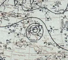 The origin of this hurricane is uncertain, though it is believed to have coalesced into a tropical depression over the central Caribbean Sea on September 23.[20] The disturbance gradually organized as it moved to the west, and strengthened to tropical storm intensity less than a day after formation and further to a hurricane by September 25. The cyclone subsequently curved northward from its initial westward motion. On September 27, the storm reached major hurricane intensity before making landfall near Cienfuegos, Cuba, as a Category 3 hurricane the next day.[8][20] After passing the island, the system reintensified and peaked with a minimum barometric pressure below 945 mbar (hPa; 27.91 inHg)[nb 3] and maximum sustained winds of 140 mph (220 km/h), making it a Category 4 hurricane. At the same time, the tropical cyclone passed over the Bahamian island of Bimini before moving out to sea. As it progressed northeastward, the hurricane gradually weakened before transitioning into an extratropical storm on October 2. The extratropical remnants traversed Newfoundland before dissipating later that day.[8][20]