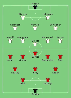 The difference in strength between the two teams was evident as the game resulted in a humiliation for Indonesia (Dutch East Indies), which managed to hold out for just 13 minutes. In the second half, although Hungary relaxed their pressure, they were never truly troubled by the opponents.[2]