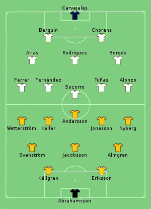 Sweden started on the front foot, taking a double lead inside 38 minutes. In the first half, Brazil looked uninspired until they got one back before half-time. In the second half, Brazil was reinvigorated and pushed for the comeback. In the second half, Leônidas scored twice and even let Patesko kick a penalty that he missed. Perácio secured the victory in the 80th minute.[2]