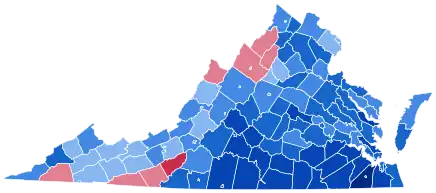 | Roanoke County | 3,539 | 60.11% | 2,302 | 39.10% | 47 | 0.80% | 1,237 | 21.01% | 5,888 |