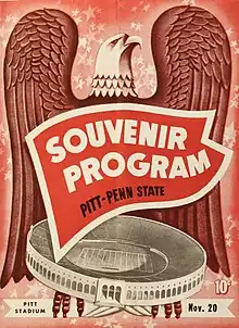 The final game on the schedule of this war-time season was against Penn State. Pitt led the all-time series 24–16–2, but the Lions had won the last two games and three of the past four games.[59] Penn State was one of two schools that had the Army, Navy and Air Force Training Programs on campus. Coach Bob Higgins had 600 trainees report for try-outs. His main problem was who would be available at game time. Oddly, Bill Abromitis was the starting halfback for the Lions. The first four weeks of the season Bill was the starting fullback for the Panthers, and then he joined the Navy.[60] The Lions were 4–3–1 for the season.[61]