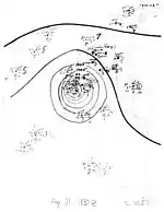 Another short-lived tropical storm was first identified about 195 mi (314 km) east of Guadeloupe by 12:00 UTC on September 9. Data from a reconnaissance aircraft indicated the storm intensified slightly to attain winds of 60 mph (97 km/h) by early the next day,[2] in spite of a poorly-defined circulation center.[3] It tracked northwest and then north, passing within 130 mi (210 km) of Bermuda before dissipating around 18:00 UTC on September 12.[2]