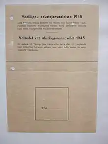 - ↑ Suomen virallinen tilasto XXIX A:20: Eduskuntavaalit vuosina 1939 ja 1945. Statistics Finland. 1946.