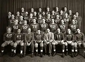 On offense, Michigan was led by a new backfield that included All-American quarterback Pete Elliott and halfbacks Chuck Ortmann and Leo Koceski. The team scored 252 points, an average of 28 points per game.[2] With Ortmann as the principal passer, the Wolverines relied on an air attack, gaining more yards in the air (1,355) than on the ground (1,262). Dick Rifenburg, the team's leading receiver, was picked as a first-team All-American at the end position. Team captain Dominic Tomasi was selected as the team's Most Valuable Player. The 1949 Michiganensian wrote of the 250-pound guard, "Famous for his sharp shattering blocking, Dom tore huge gaps in the opposing lines to pave the way for Michigan's steam roller offense."[3]