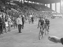 Roger Lambrecht winning the second stage ahead of Jacques Marinelli at Heysel Stadium in Brussels