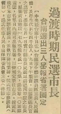 - ↑ 蔡, 秀玲 (2007). "台灣首屆縣市長選舉之研究(1950〜1951)". National Tsinghua University (in Chinese (Taiwan)). Archived from the original on 2014-11-04.