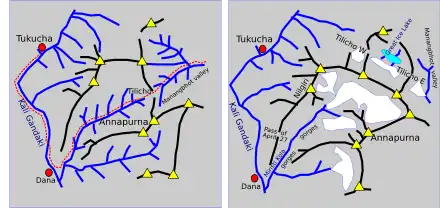 Dhaulagiri and Annapurna are 34 kilometres (21 miles) apart on either side of the gorge of the Kali Gandaki river, a tributary of the Ganges.[11][26] As the expedition approached from the south Dhaulagiri was clearly visible as a white pyramid to the west whereas Annapurna to the east was hidden behind the Nilgiri mountains. On first seeing Dhaulagiri on 17 April the immediate impression was that it was unclimbable. They could not see Annapurna but there was a break in the Nilgiris where the Miristi Kola flows into the Kali Gandaki through a deep and narrow gorge with an impenetrable entrance. The 1920s Survey of India map they were using (see left-hand Annapurna map below) showed a path leading up the gorge and over "Tilicho Pass" that might provide a route to the north face of Annapurna. However, none of the local inhabitants they spoke to knew of a path or had any further information. Continuing up the Kali Gandaki Gorge the team reached the market town of Tukusha at 2,600 metres (8,500 ft) on 21 April. The people lived there in primitive conditions – Terray described the place as having "biblical charm".[note 10] Couzy climbed a 4,000-metre (13,000 ft) Nilgiri peak to the east of Tukusha to inspect the eastern Dhaulagiri terrain and he concluded the southeast ridge was "absolutely frightful". Even so, Herzog decided that they should first focus on Dhaulagiri, the higher mountain, since they would only have to investigate possible routes to the summit and would not have to reconnoitre to find the mountain itself.[28]