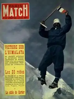 The telegram giving news of the success was reported by Le Figaro on 16 June but it was only on 17 July that the team arrived home at Orly Airport in Paris to be greeted by a wildly cheering crowd. Herzog was carried off the aircraft first.[98] Paris Match printed a special edition for 19 August with articles about the expedition and the cover photo, taken by Lachenal but credited to Ichac, showing Herzog with his ice axe and Tricolour at the summit (see image at head of article). The magazine sold in record numbers and the photo remained an iconic image for years to come.[note 22] Herzog, Lachenal and Ang Tharkay were awarded the Légion d'honneur.[note 23][86][102] On 17 February 1951 Paris Match again ran the expedition on its front cover, this time focusing on the cinema premiere (attended by the President of France) of the film made by Ichac. The cover described Herzog as "our number one national hero" – in the accompanying six-page article Lachenal was not mentioned at all.[103]