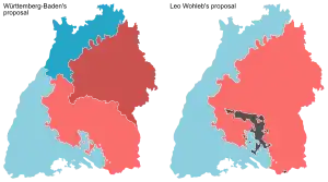 In the Frankfurt Documents, the Western allies asked the state heads of governments for proposals for state border changes.[11] There were no proposals for any changes outside of southwestern Germany. The question of border changes was postponed until after the foundation of the Federal Republic, however, because the representatives of the three states could not agree on what course of action to take. The government of Württemberg-Hohenzollern proposed the unification of all three states,[12] which State-President Wohleb from Baden categorically rejected. He instead proposed the restoration of the old state of Baden, as espoused by the constitution of his state. However, the American military government opposed the division of Württemberg-Baden. North Baden politicians, fearing that unification with southern Baden would mean expansion of the harsh French reparations policy into the north, also opposed it.