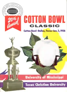 The 1956 Cotton Bowl Classic was the twentieth edition of the college football bowl game, played at the Cotton Bowl in Dallas, Texas, on Monday, January 2. Part of the 1955–56 bowl game season, it matched the sixth-ranked TCU Horned Frogs of the Southwest Conference (SWC) and the #10 Ole Miss Rebels of the Southeastern Conference (SEC). Underdog Ole Miss rallied to win by a point, 14–13.[2][3]