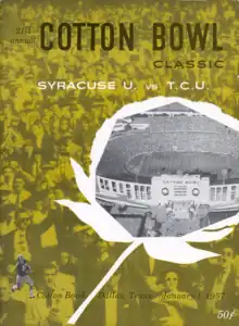 The 1957 Cotton Bowl Classic was the 21st edition of the college football bowl game, played at the Cotton Bowl in Dallas, Texas, on Tuesday, January 1. Part of the 1956–57 bowl game season, it matched the independent and eighth-ranked Syracuse Orangemen and #14 TCU Horned Frogs of the Southwest Conference (SWC).[2] Favored TCU held on to win by a point, 28–27.[3]