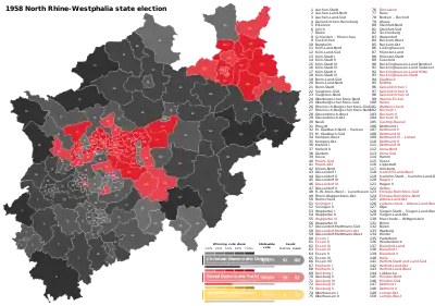 The result was a landslide victory for the opposition Christian Democratic Union (CDU), which won an absolute majority of both votes and seats on a swing of over nine percentage points. Despite its defeat, the SPD also improved its vote share to 39%. The main losses were felt by minor parties: the FDP fell to 7%, while the Centre Party collapsed to 1% and left the Landtag for good. Other parties which had fallen short of entering parliament in 1954, the KPD and BHE, no longer ran.