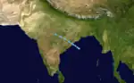Deep Depression Seven existed from September 8 to September 15.[9] The storm moved from east to west throughout its lifetime. It formed on September 8 in the western Bay of Bengal and made landfall on eastern India on September 8. The depression crossed India and traced the western coast of the country from September 10 to September 14, making two sharp turns along the way. The storm dissipated in the extreme northern Arabian Sea on Septemebr 15.