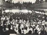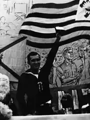 "Corporal Anselmo," known for his oratory skills, made a very political speech, speaking of "latifundium," "imperialism," "basic reforms," and "exploited". His rhetoric was fully aligned with the left of the time, and his agendas were compatible with those of the CGT, União Nacional dos Estudantes (UNE), Pacto de Unidade e Ação, and Frente Parlamentar Nacionalista.[56][57] The concepts were not unheard of and revealed a closeness to Brizolism.[58] Communist Carlos Marighella collaborated in the writing of the text, as Anselmo and Antônio Duarte report.[56] The speech was addressed to the President of Brazil, declaring himself in favor of his reforms, and sought his support by emphasizing that the sailors belonged to the "popular classes".[57]